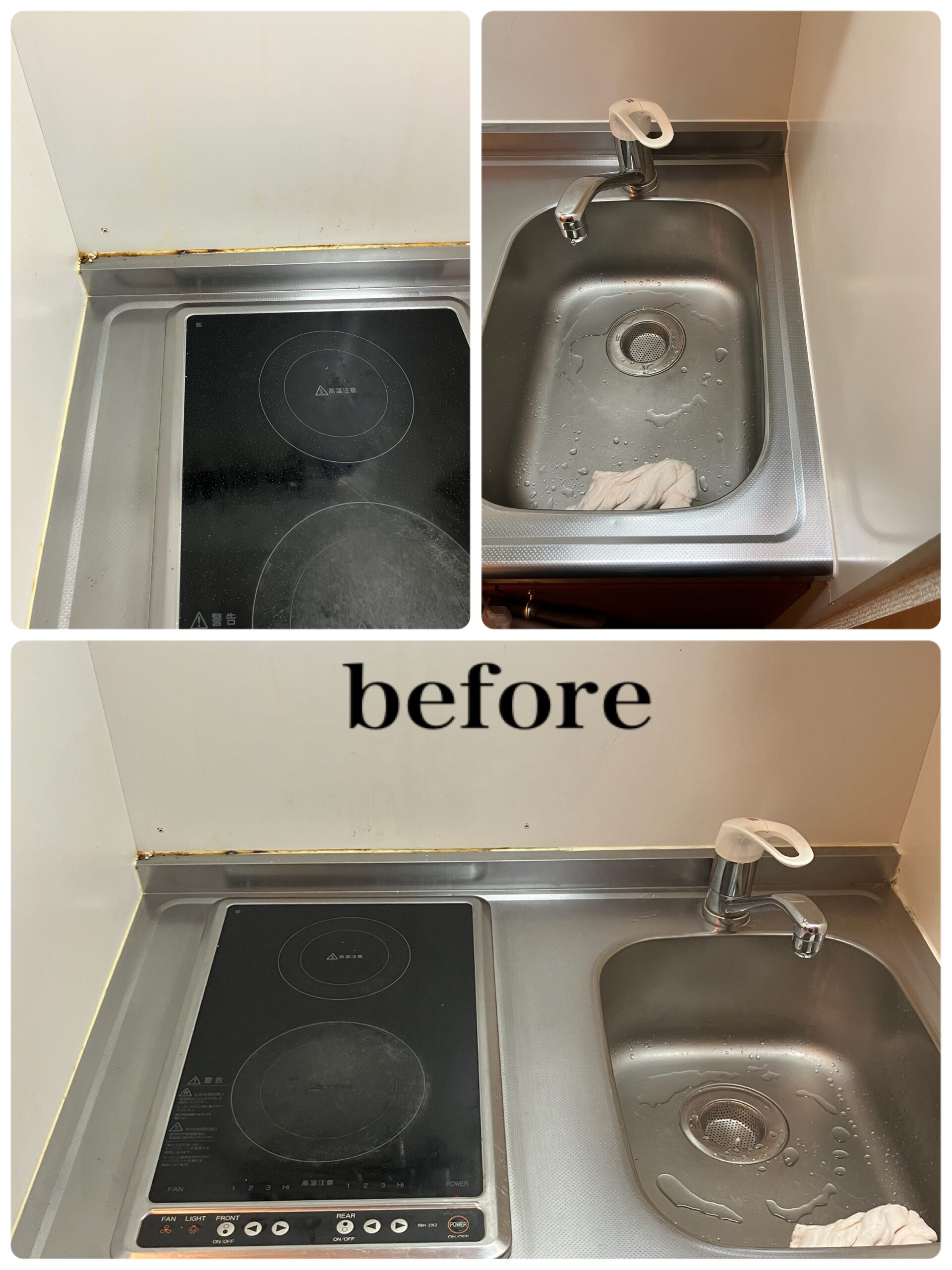 今回の物件もカビや汚れがコンロ周りなどが特にひどくコーキングも一部めくれかかっている箇所なども見られました!
