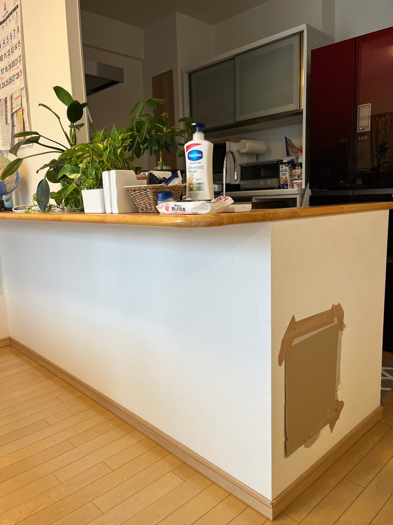 本日の現場はキッチンカウンター下の壁穴補修と壁紙張り替えの工事となります!