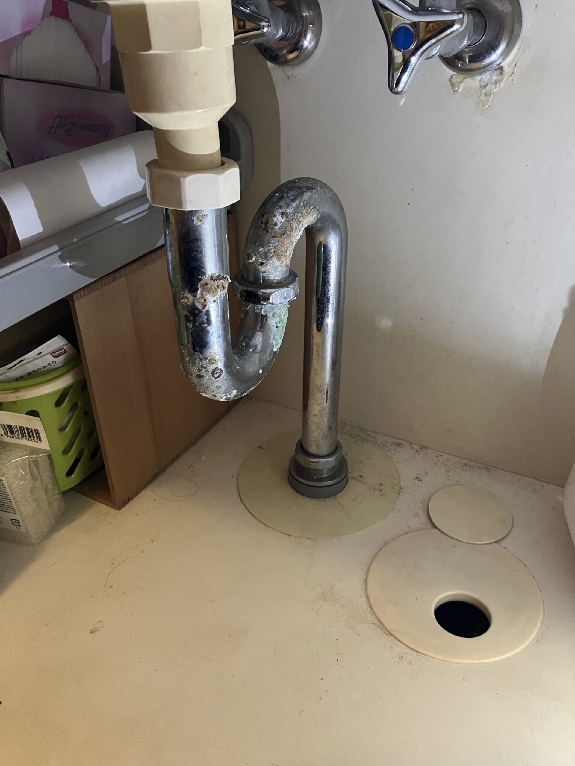 ご依頼頂いた際は洗面台下収納部分の止水栓やどこかから水漏れしてるということで見てほしいとのご依頼でお伺いしましたが、お伺いして確認させて頂きましたが水漏れはなく恐らく結露や湿気での水気があったのかということで様子見てくださいっというお話となりましたが、排水管が緑錆が出ており、いつ配管が割れたり破損してもおかしくない状態でした!